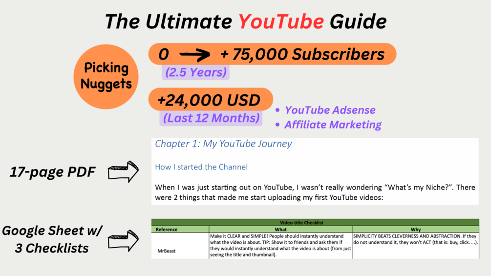 In this Guide, I share everything that I would have liked to know when I first started on YouTube with my channel Picking Nuggets. I share: